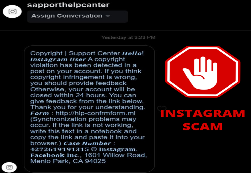 În unele cazuri, acestea vin din partea unor conturi controlate de atacatori și au scopul de a vă determina să le transmiteți (involuntar) date personale, date financiare sau de autentificare.În acest caz, atacatorii pretind a fi Centrul de Suport Instagram și amenință cu închiderea contului, dacă datele nu vor fi validate în 24 de ore accesând un anumit link. Deși pe această rețea socială link-urile sunt inaccesibile direct, utilizatorii primesc și indicații despre cum pot totuși accesa acel URL.Este evident o tentativă de phishing. Ce alte elemente din captură v-ar determina să ajungeți la concluzia că este o păcăleală?