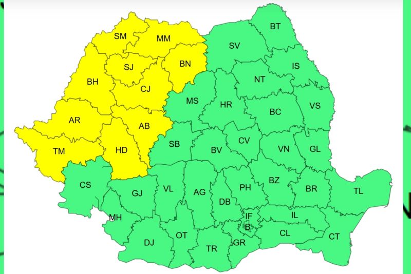 Codul galben de vreme deosebit de caldă va afecta județele: Alba, Arad, Bihor, Bistrița-Năsăud, Cluj, Hunedoara, Maramureș, Sălaj, Satu Mare și Timiș.