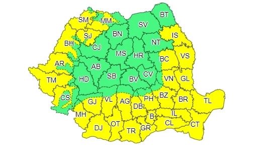Meteorologii au emis vineri o avertizare Cod galben de caniculă valabilă până duminică în 29 de județe din țară. Potrivit ANM, sunt vizate județele Maramureș, Satu Mare, Sălaj, Bihor, Arad, Timiș, Caraș-Severin, Mehedinți, Gorj, Vâlcea, Dolj, Argeș, Olt, Dâmbovița, Teleorman, Prahova, Giurgiu, Ilfov, Călărași, Ialomița, Constanța, Tulcea, Brăila, Buzău, Galați, Vrancea, Vaslui, Bacău și Iași.