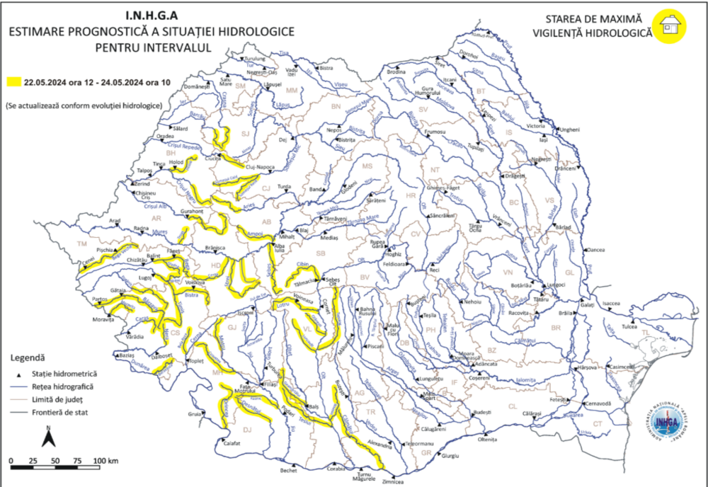 Începând de miercuri, de la ora 12.00, până vineri la ora 10.00, va fi în vigoare Cod galben care va afecta râuri din bazinele hidrografice Crasna, Barcău, Someşul Mic, Crişul Repede, Crişul Negru, Crişul Alb, Mureş, Bega, Timiş, Bârzava, Caraş, Nera, Cerna, afluenţii mici ai Dunării amonte confluenţă cu râul Desnăţui, Desnăţui, Jiu, Olt, Călmăţui.