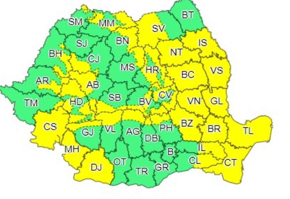 Meteorologii au emis duminică o nouă avertizare Cod galben de vânt, valabilă în 34 de județe până luni seara. Potrivit ANM, sunt vizate județele Cluj, Bihor, Alba, Arad, Hunedoara, Timiș, Caraș-Severin, Mehedinți, Gorj, Sibiu, Vâlcea, Brașov, Argeș, Dâmbovița, Prahova, Călărași, Ialomița, Constanța, Tulcea, Brăila, Galați, Buzău, Covasna, Vrancea, Harghita, Vaslui, Bacău, Iași, Neamț, Mureș, Suceava, Bistrița-Năsăud, Maramureș și Satu Mare.