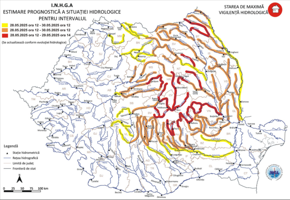 Sunt vizate fenomene periculoase precum scurgeri importante pe versanți, torenți și pâraie, viituri rapide pe râurile mici, însoțite de posibile efecte de inundații locale și creșteri semnificative ale debitelor și nivelurilor, care pot conduce la depășiri ale cotelor de apărare.Începând cu data de 28 mai, ora 12:00, și până la 29 mai, ora 14:00, este în vigoare Codul Roșu pentru județele: Harghita, Mureș, Brașov, Sibiu, Prahova, Buzău, Neamț, Bacău, Covasna, Vrancea, Botoșani și Iași.Totodată, în intervalul 28 mai, ora 12:00 – 29 mai, ora 24:00, este activ un Cod Portocaliu pentru pentru râuri din Transilvania, Muntenia, Oltenia și Moldova, în județele: Harghita, Mureș, Bistrița-Năsăud, Brașov, Sibiu, Alba, Argeș, Dâmbovița, Vâlcea, Prahova, Ilfov, Ialomița, Buzău, Suceava, Neamț, Bacău, Covasna, Vrancea, Iași, Vaslui, Galați și Botoșani.De asemenea, în intervalul 29 mai, ora 12:00 – 30 mai, ora 12:00, avertizarea Cod Portocaliu este menținută pentru județul Botoșani, în bazinul hidrografic Prut, sectorul amonte de Acumularea Stânca Costeşti.În paralel, în perioada 28 mai, ora 12:00 – 30 mai, ora 12:00, este în vigoare un Cod Galben pentru râuri din Maramureș, Transilvania, Moldova, Muntenia și Oltenia, în județele: Maramureș, Bistrița-Năsăud, Cluj, Harghita, Mureș, Brașov, Sibiu, Alba, Covasna, Vâlcea, Argeș, Dâmbovița, Giurgiu, Teleorman, Ilfov, Prahova, Ialomița, Buzău, Brăila, Suceava, Neamț, Bacău, Vaslui, Iași, Vrancea și Galați.În acest context, populația este rugată să manifeste responsabilitate, să evite deplasările în apropierea râurilor aflate sub avertizare, să își protejeze bunurile și să urmărească în permanență comunicările oficiale ale autorităților.Este esențial ca, în caz de necesitate, persoanele din zonele vizate să colaboreze cu echipele de intervenție și să respecte cu strictețe instrucțiunile primite.În funcție de evoluția fenomenelor hidrometeorologice vom reveni cu actualizarea prognozei hidrologice.