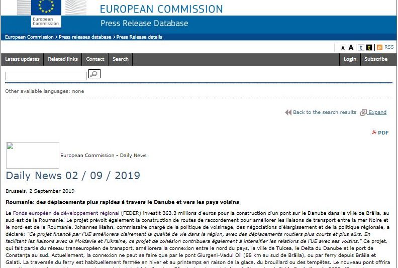 "Acest proiect, care face parte din rețeaua de transport transeuropeană, va îmbunătăți conexiunea dintre nordul țării, orașul Tulcea, Delta Dunării și portul Constanța la sud. În prezent, conexiunea nu poate fi făcută decât de podul Giurgeni-Vadul Oii (la 88 km sud de Brăila), sau cu BAC-ul de la Brăila și de la Galați spre Tulcea. Trecerea cu BAC-ul este de obicei închisă iarna și primăvara din cauza gheții, ceaței sau furtunilor. Noul pod va oferi o alternativă mai rapidă, cu un timp de călătorie redus de aproximativ 50 de minute. Proiectul ar trebui finalizat până la sfârșitul anului 2023. (Pentru mai multe informații: Christian Spahr - Tel: +32 2 295 00 00 55 Sophie Dupin de Saint-Cyr - Tel .: +32 229 56169)", se mai arată în comunicatul Comisariatului pentru politica de vecinătate, negocierile de extindere și politica regională.