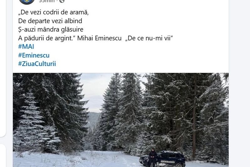 ”De vezi codrii de aramă / De departe vezi albind / Ş-auzi mândra glăsuire/ A pădurii de argint.” Mihai Eminescu „De ce nu-mi vii””, a postat Ministerul Afacerilor Interne pe Facebook.