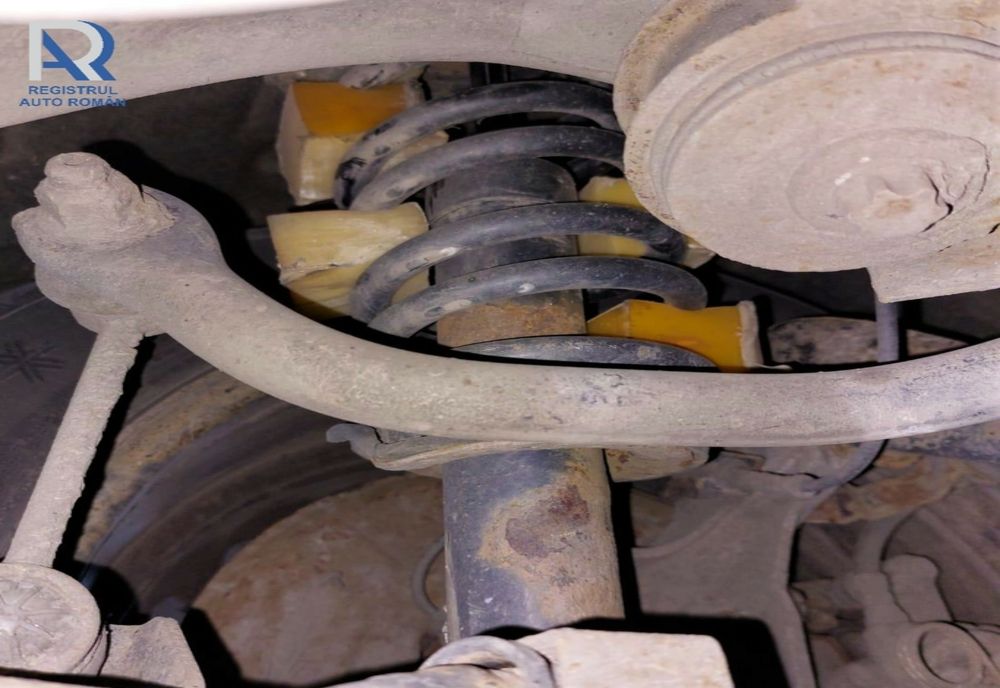 Acest vehicul s-a prezentat la RAR Tulcea pentru redobândirea certificatului de îmnatriculare, reținut în urma unui control în trafic. Verificând mașina, colegii noștri au observat bucățile de cauciuc dur introduse între spirele unuia dintre arcurile suspensiei.