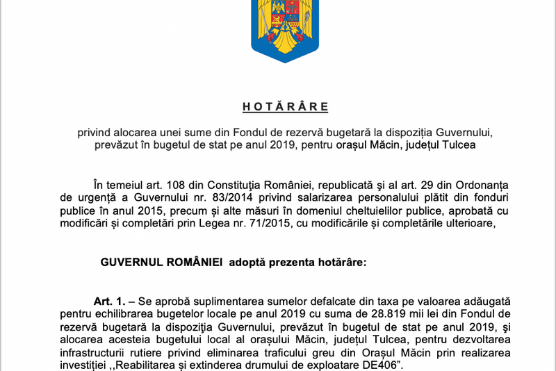 – Se aprobă suplimentarea sumelor defalcate din taxa pe valoarea adăugată pentru echilibrarea bugetelor locale pe anul 2019 cu suma de 28.819 mii lei din Fondul de rezervă bugetară la dispoziţia Guvernului, prevăzut în bugetul de stat pe anul 2019, şi alocarea acesteia bugetului local al orașului Măcin, județul Tulcea, pentru dezvoltarea infrastructurii rutiere privind eliminarea traficului greu din Orașul Măcin prin realizarea investiției ,,Reabilitarea și extinderea drumului de exploatare DE406”.