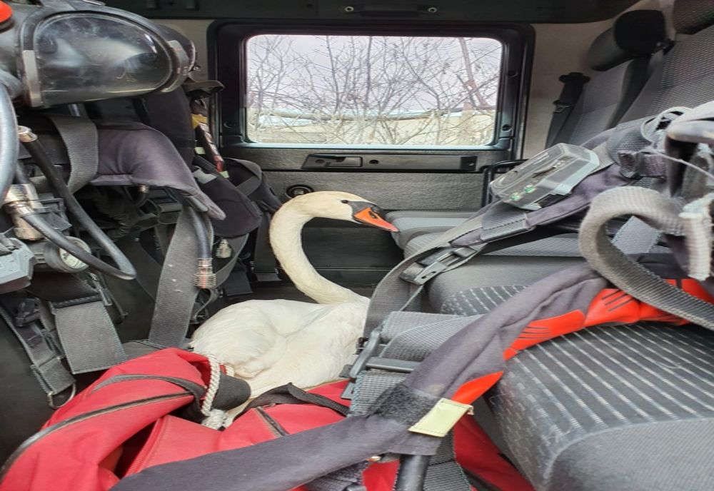 Lebădă salvată de la îngheț, în "misiune" cu pompierii la stingerea unui incendiu