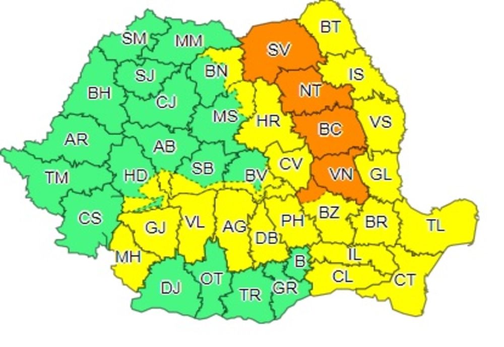 În județele Suceava, Neamț, Bacău, Vrancea şi zona de munte a judeţului Buzău va ploua abundent și se vor acumula cantități de apă de 40...50 l/mp și izolat 60...70 l/mp.