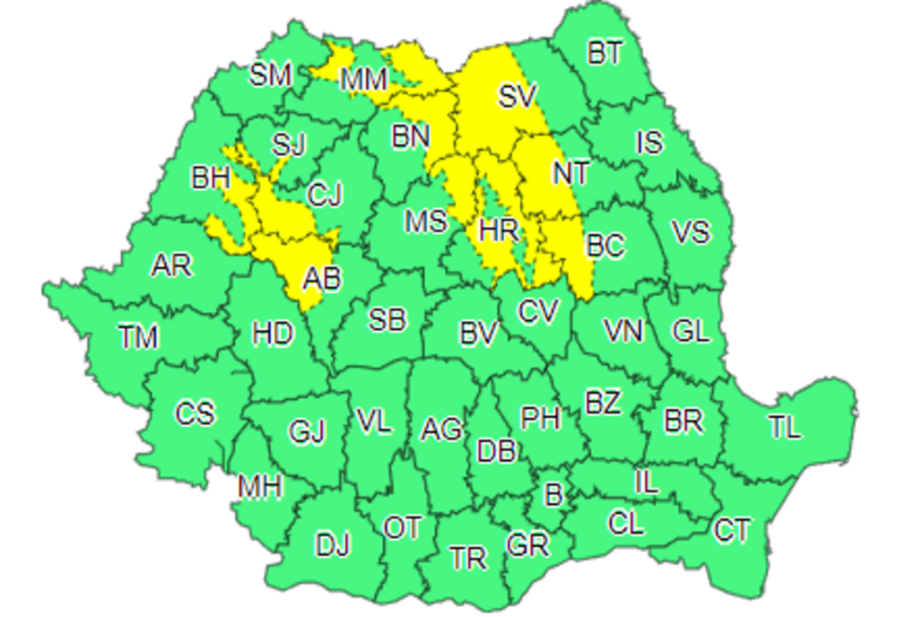 Codul galben vizează unele zone ale judeţelor Maramureş, Bistriţa-Năsăud, Suceava, Neamţ, Bacău, Harghita, Mureş, Sălaj, Cluj, Alba şi Bihor.