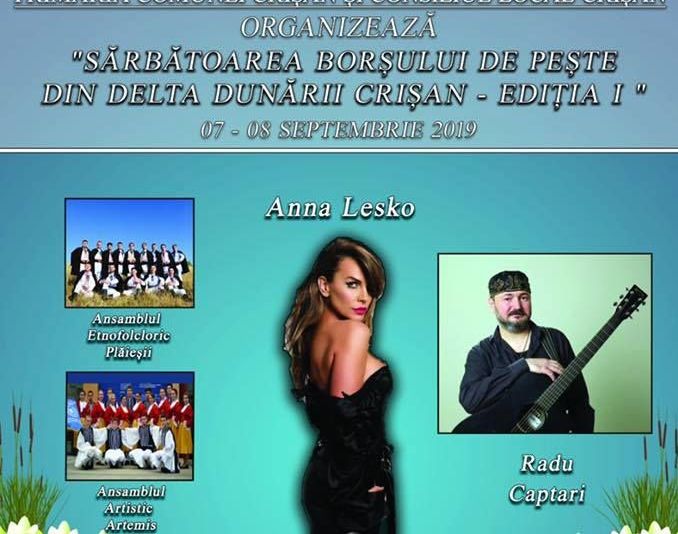 Sâmbătă, 7 septembrie, și duminică, 8 septembrie, Primăria Comunei Crișan, Consiliul Local Crișan și Asociația Delta Dunării (AMDTDD) organizează, în centrul localității Crișan, în inima Deltei, prima ediție a Sărbătorii Borșului de Pește din Delta Dunării. Sărbătoarea este destinată în principal turiștilor, fiind aşteptaţi peste două mii, și își propune să valorifice tradițiile gastronomice și culturale ale Deltei Dunării.Cei interesaţi pot ajunge la Crişan pentru această sărbătoare cu o cursă specială a Navrom Delta ce va pleca la ora 8.00 spre Crişan din Portul Tulcea şi din Crişan spre Tulcea la ora 17.00. Preţul unei călătorii dus-întors este 76 de lei de persoană.În cele două zile ale Sărbătorii Borșului de Pește din Delta Dunării vor avea loc prezentări gastronomice, concursuri de gătit între turiștii cazați în localitate și numeroase momente artistice. Pe lângă ansamblurile folclorice care vor prezenta momente artistice specifice etniilor care conviețuiesc în Delta Dunării, capetele de afiș ale spectacolelor muzicale vor fi Plăieșii, Radu Captari și Ana Lesko.În continuare găsiți întregul program al Sărbătorii Borșului de Pește din Delta Dunării – Crișan, ediția I: