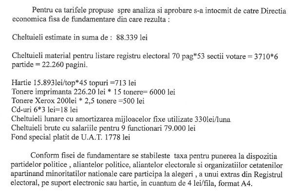 O notă de fundamentare ce a Direcţiei Economice din cadrul primăriei Municipiului Tulcea a stabilit că pentru a li se pune la dispoziția partidelor politice, alianţelor politice, alianţelor electorale şi organizaţiilor cetăţenilor aparţinând minorităţilor naţionale un astfel de extras din Registrul electoral trebuie achitată o taxă de 4 lei/filă, format A4. "Cam scumpă hârtia la Tulcea!", a sesizat un reprezentant al unui partid politic a cărui nume nu îl vom aminti. Dar nu atât hârtia cât mai ales fila de registru care se oferă, "cu generozitate", partidelor politice, alianţelor politice, alianţelor electorale şi organizaţiilor cetăţenilor aparţinând minorităţilor naţionale la preţ de două ziare şi ceva, spre exemplu."Pentru tarifele propuse spre analiză şi aprobare s-a întocmit de către Direcţia economică fişa de fundamentare din care rezultă:Cheltuieli estimate în suma de: 88.339 leiCheltuieli material pentru listare registru electoral 70 pag*53 secţii votare = 3710*6 partide = 22.260 pagini.Hârtie 15,893 lei/top x 45 topuri =713 leiTonere imprimantă 226,20 lei x 15 tonere= 6.000 leiTonere Xerox 200 lei x 2,5 tonere =500 leiCd-uri 6 x 3 lei= 18 leiCheltuieli lunare cu amortizarea mijloacelor fixe utilizate - 330 lei/lunăCheltuieli brute cu salariile pentru 9 funcţionari - 79.000 lei (!!!)Fond special plătit de U.A.T. - 1778 leiConform fişei de fundamentare se stabileşte taxa pentru punerea la dispoziţia partidelor politice, alianţelor politice, alianţelor electorate şi organizaţiilor cetăţenilor aparţinând minorităţilor naţionale care participă la alegeri, a unui Extras din Registrul electoral, pe suport electronic sau hârtie, în cuantum de 4 lei/filă, format A4." - se arată în nota de fundamentare ce a stat la baza hotărârii adoptate săptămâna trecută.Nu ne permitem să plătim o astfel de sumă pentru Extrasul din Registrul ElectoralExtrasul din Registrul Electoral este util partidelor politice, alianţelor politice, alianţelor electorate şi organizaţiilor cetăţenilor aparţinând minorităţilor naţionale pentru multe lucruri. Unul dintre ele este acela că practic se intră în posesia bazei de date a electoratului "la zi". Mai sunt şi alte utilităţi ce i se dau acestei baze de date importante, dar care ţin de bucătăria internă a fiecărui competitor electoral din categoria celor mai sus amintiţi. De la care sunt exceptaţi - surpriză! - cadidaţii independenţi. Tulcea are un primar independent care n-a avut acces la Extrasul din Registrul Electoral nici în 2016 şi probabil nici nu va avea acces nici în 2020, dacă va mai candida. Mai bine zis dacă va mai candida tot independent.Legat de acest aspect, primarul independent al municipiului Tulcea, a declarat: "Nu am facut un calcul în ceea ce priveşte taxa ce trebuie plătită de fiecare competitor politic, dar dacă sunt aşa mulţi bani probabil că reuşim astfel să ne echilibrăm bugetul local cu banii de la partide. Că doar bugetul naţional a oferit sume generoase partidelor politice anul acesta, nu?".