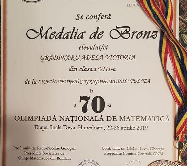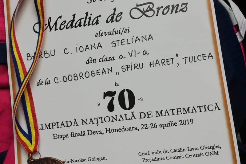 Două eleve din Tulcea au obţinut medalii de bronz la ediţia de anul acesta a Olimpiadei Naționale de Matematică. Medaliile au fost oferite de Societatea de Științe Matematice din România în cadrul festivităţii ce a avut loc ieri la Deva, oraşul gazdă al olimpiadei.Anul acesta, Olimpiada Națională de Matematică, aflată la cea de-a 70-a ediţie s-a desfăşurat în perioada 22-26 aprilie la Deva, în judeţul Hunedoarea.La această ediţie a 70-a, de la Tulcea s-au calificat trei eleve şi un elev, de la patru unităţi de învăţământ diferite, toate din municipiu.Este vorba despre:Eliza Stoian, elevă în clasa a V-a la Liceul Teoretic Ion Creangă din Tulcea având pe Sanda Barbu profesor îndrumător,