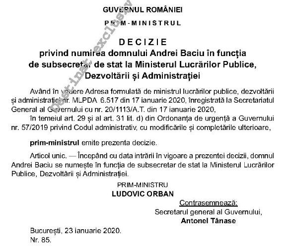 De ieri, unul dintre cele mai "grele" ministere are - potrivit Deciziei 85, semnată de primul ministru al României, Ludovic Orban - un tulcean în funcţia de subsecretar de stat.Andrei Baciu, fost şef Serviciu Comercial în cadrul Societății de Transport Public (STP) Tulcea, a fost numit, printr-o Decizie a premierului Ludovic Orban, în funcţia de subsecretar de stat la Ministerul Lucrărilor Publice, Dezvoltării şi Administraţiei, hotărârea fiind publicată în Monitorul Oficial, nr 48 din 23 ianuarie 2020. (foto)
