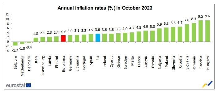 De asemenea, datele Eurostat arată că în zona euro rata anuală a inflaţiei a scăzut de la 4,3% în luna septembrie, până la 2,9% în luna octombrie. Pentru statele din zona euro, cel mai semnificativ impact asupra creşterii anuale a preţurilor a venit din partea preţurilor la servicii care au înregistrat un avans de 1,97 puncte procentuale, urmate de preţurilor la alimente, băuturi alcoolice şi ţigări care au crescut cu 1,48 puncte procentuale. În schimb, preţurile la energie au scăzut cu 1,45 puncte procentuale.