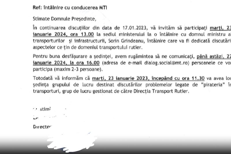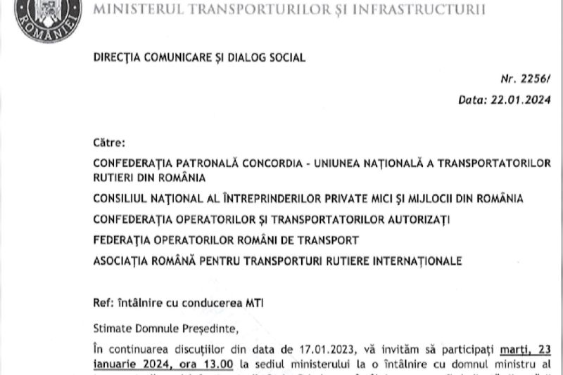 Intalnirea intre reprezentantii Ministerului Transporturilor si cei ai asociatiilor de transportaori a fost programata pentru ziua de marti, 23 ianuarie, relatează Realitatea PLUS.