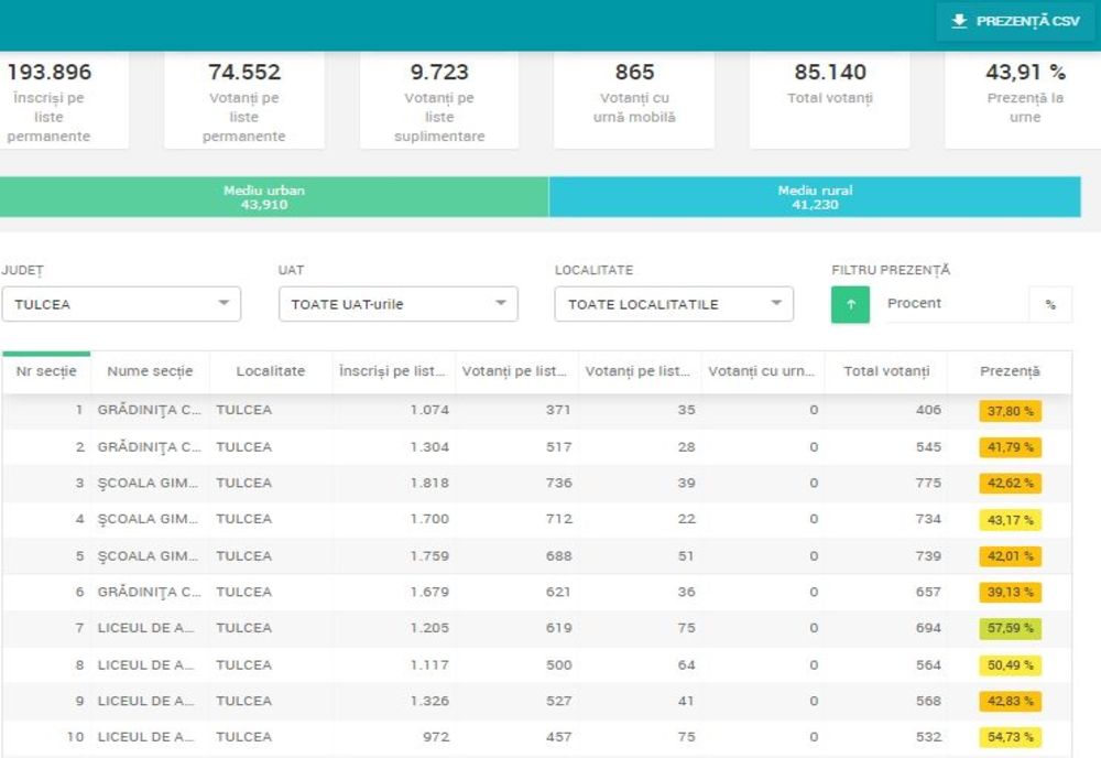 Tulcea rezultate finale: 43,91 % - Prezență la urne şi 85.140 Total votanți