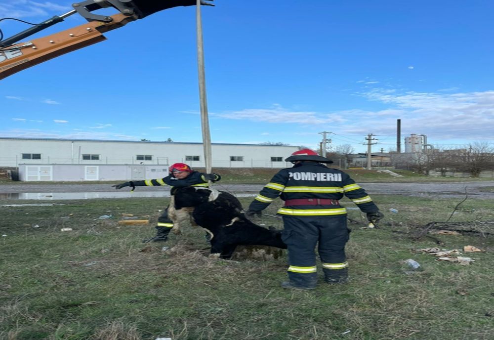 Pompierii militari au fost solicitați să intervină pentru extragerea unei vite căzute într-un cămin de canalizare, în localitatea Babadag, județul Tulcea.