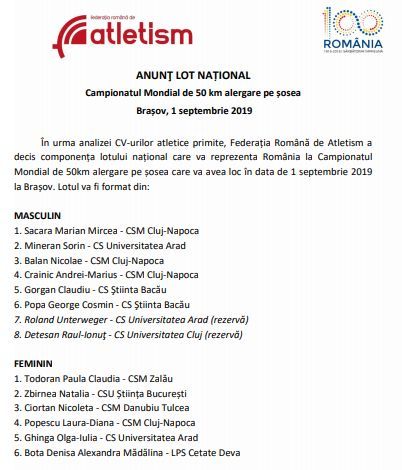 Federația Română de Atletism a definitivat zilele trecute lotul național pentru Campionatul Mondial de ultramaraton – 50 de kilometri alergare pe șosea. Competiția se va desfășura la Brașov, pe 1 septembrie, unde sunt aşteptaţi peste 400 de atleţi din întreaga lume.