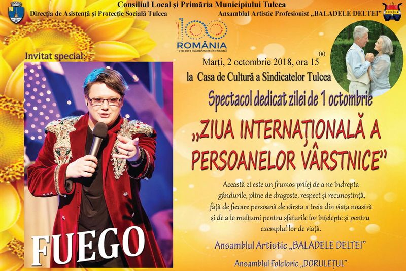 Consiliul Local și Primăria Municipiului Tulcea, Direcția de Asistență și Protecție Socială Tulcea și Ansamblul Artistic Profesionist ”Baladele Deltei” organizează Marți, 2 octombrie 2018 la Casa de Cultură a Sindicatelor Tulcea , spectacol dedicat zilei de 1 octombrie ” Ziua Internațională a persoanelor vârstnice” . Această zi este un frumos prilej de a ne îndrepta gândurile, pline de dragoste, respect și recunosștință, față de fiecare persoană de vârsta a treia din viața noastră și de a le mulțumi pentru sfaturile lor înțelepte și pentru exemplul lor de viața.