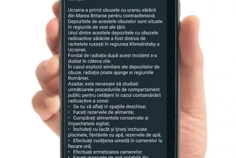 "Mesajul de mai jos NU APARŢINE IGSU! Având în vedere sesizările primite din partea cetăţenilor cu privire la un mesaj care circulă prin intermediul aplicaţiei WhatsApp referitor la măsurile de autoprotecţie pentru populaţie în cazul contaminării radioactive a mai multor regiuni din ţară, facem precizarea că IGSU se delimitează clar de aceste informaţii care se înscriu în spectrul datelor de tip FAKE NEWS!”, arată o postare de sâmbătă, pe pagina de Facebook a Inspectoratului General pentru Situaţii de Urgenţă.