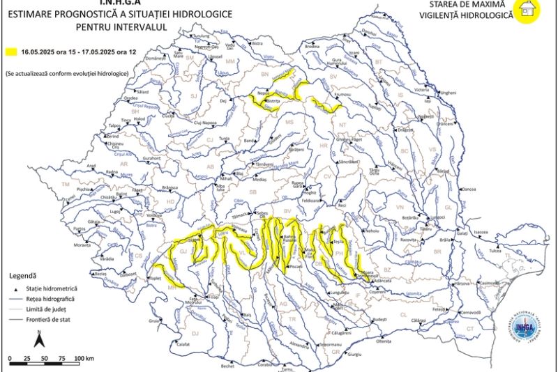 Institutul Național de Hidrologie și Gospodărire a Apelor (INHGA) a emis vineri o avertizare Cod galben de inundații și viituri rapide, valabilă în 13 județe, ca urmare a condițiilor meteorologice nefavorabile. Avertizarea intră în vigoare vineri, de la ora 15:00, și se menține până sâmbătă, ora 12:00.