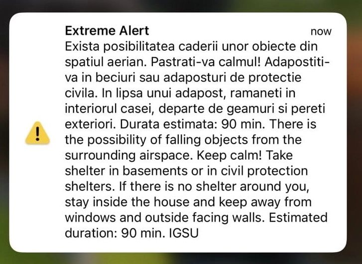 "Există posibilitatea căderii unor obiecte din spaţiul aerian. Păstraţi-vă calmul! Adăpostiţi-vă în beciuri sau adăposturi de protecţie civilă. În lipsa unui adăpost, rămâneţi în interiorul casei, departe de geamuri şi pereţi exteriori.