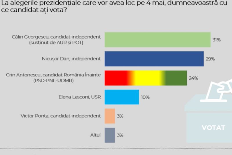 Încă un sondaj care prevede victoria suveraniștilor. Conform celui mai nou sondaj de opinie, Călin Georgescu se clasează pe prima poziţie, cu 31%, în intenţiile de vot ale bucureştenilor pentru alegerile prezidenţiale din 4 mai.