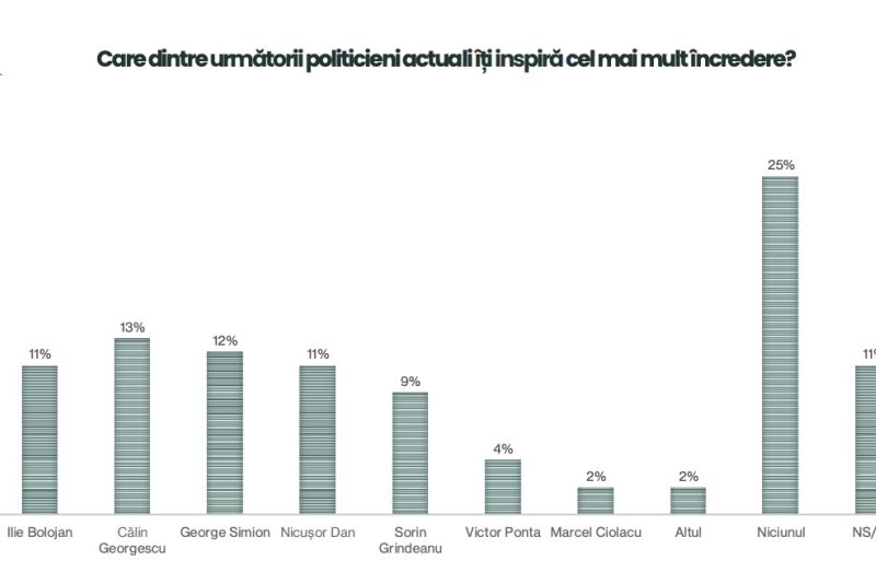 Datele centralizate de același sondaj mai arată că societatea contestă binomul Nicușor Dan - Ilie Bolojan. Încrederea românilor în cei doi este în continuare pe un trend descendent. În schimb, suveranistul Călin Georgescu se bucură de cea mai mare încredere în rândul populației, urmat îndeaproape de liderul AUR, George Simion.