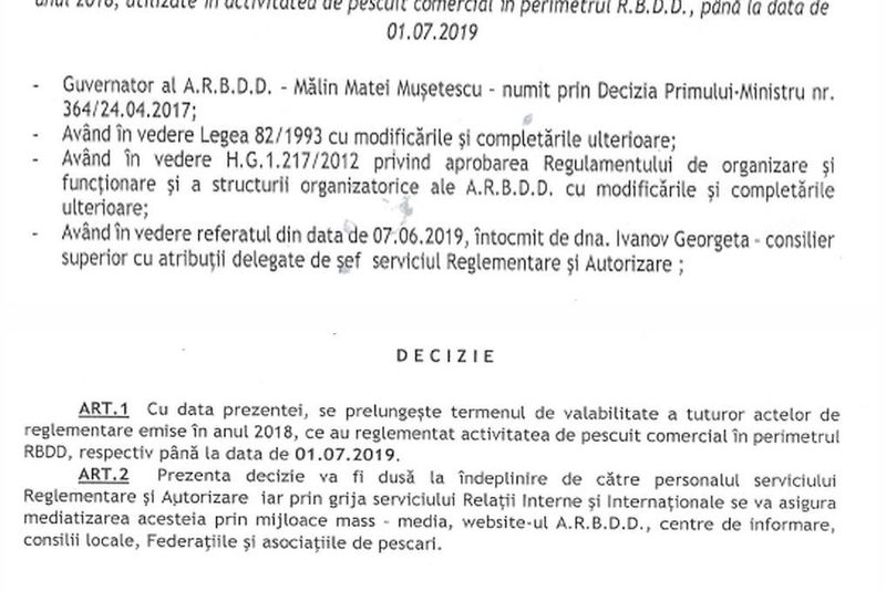 În cursul zilei de azi, 7 iunie 2019, Guvernatorul Administraţiei Rezervaţiei Biosferei Delta Dunării, Mălin Matei Muşetescu, numit prin Decizia Primului-Ministru nr. 364/24.04.2017, în temeiul prevederilor din Legea 82/ 1993, cu modificările și completările ulterioare, precum şi ale H.G. 1.217/2012 privind aprobarea Regulamentului de organizare şi funcționare și a structurii organîzatorice ale ARBDD, cu modificările și completările ulterioare, a emis şi semnat (în baza referatului întocmit de dna. lvanov Georgeta - consilier superior cu atribuţii delegate de șef serviciul Reglementare și Autorizare) Decizia 251 din 07.06.2019.