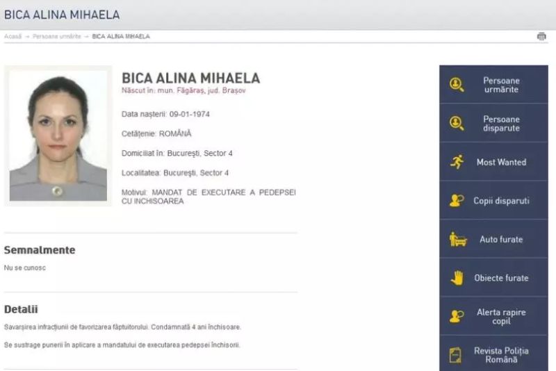 Alina-Mihaela Bica era urmărită internațional, cu mandat european, pentru infracțiunea de favorizarea infactorilor, fiind condamnată la 4 ani de închisoare cu executare.